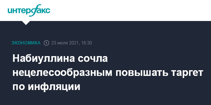 "Будем рассматривать и саму формулировку цели: будет она точечной, диапазонной, и в том числе уровень цели, что говорит о том, что если и будет эта цель пересматриваться с точки зрения количественных значений, то, скорее, в сторону понижения, не в сторону повышения", - заявила Набиуллина.