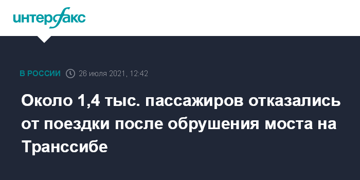 Москва. 26 июля. INTERFAX.RU - Около 1,4 тыс. пассажиров отказались от поездки после обрушения моста на Транссибирской магистрали в Забайкалье.