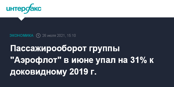 Москва. 26 июля. INTERFAX.RU - Пассажирооборот группы "Аэрофлот" в июне 2021 года упал на 31% к июню "доковидного" 2019-го (без учета показателей покинувшей группу "Авроры"), до 9,9 млрд пассажиро-километров, следует из сообщения компании.