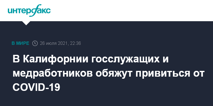 Москва. 26 июля. INTERFAX.RU - Власти американского штата Калифорния приняли решение потребовать от всех госслужащих и медицинских работников либо предоставить свидетельства вакцинации от COVID-19, либо еженедельно проходить тестирование на вирус, передает в понедельник агентство Associated Press (AP).