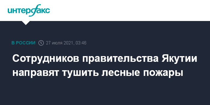 "Лепчиков отметил, что 28 июля на тушение пожаров от исполнительных органов власти будут направлены добровольцы по линии Минспорта, 30 июля - Минарктики, министерства финансов и министерства строительства республики", - сообщила пресс-служба правительства Якутии по итогам заседания оперативного штаба.