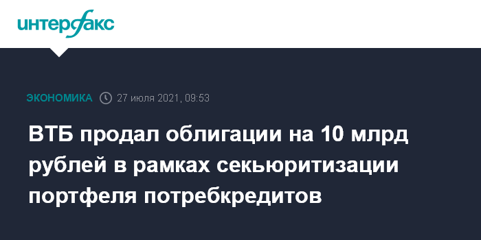 Москва. 27 июля. INTERFAX.RU - ВТБ продал облигации на 10 млрд рублей в рамках секьюритизации портфеля потребкредитов объемом до 35 млрд рублей, заявил журналистам заместитель президента - председателя правления ВТБ Анатолий Печатников.