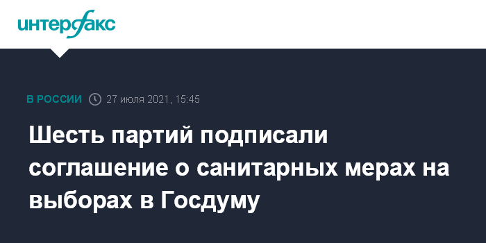 Москва. 27 июля. INTERFAX.RU - Партии "Единая Россия", ЛДПР, "Родина", "Гражданская платформа", "Зеленые" и "Новые люди" подписали соглашение о проведении в сентябре выборов с соблюдением всех санитарных мер в условиях пандемии. Инициаторы заключения соглашения - единороссы.
