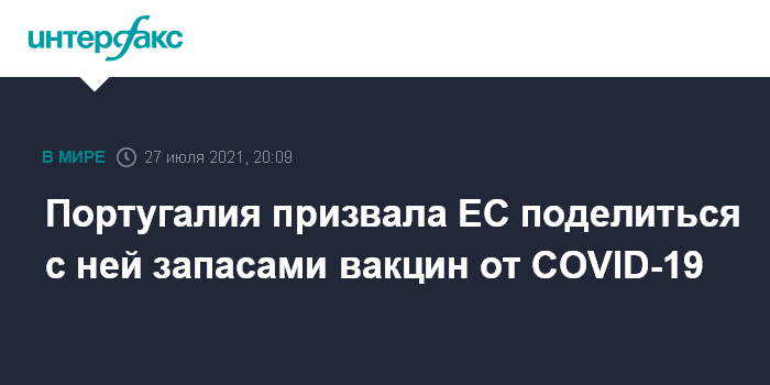 Москва. 27 июля. INTERFAX.RU - Лиссабон в целях ускорения вакцинационной кампании от COVID-19 попросил другие страны Европы выделить Португалии часть своих вакцин. Об этом сообщают во вторник западные СМИ со ссылкой на главу Минздрава страны Марту Темиду.