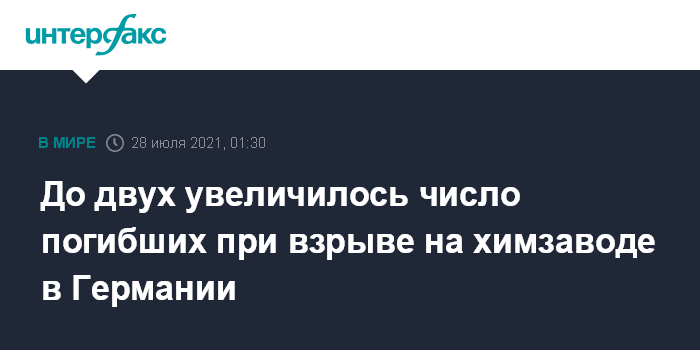 Москва. 28 июля. INTERFAX.RU - Не менее двух человек погибли при взрыве на химическом предприятии Chempark в ФРГ в городе Леверкузен, сообщается в пресс-релизе на сайте компании-оператора Currenta.
