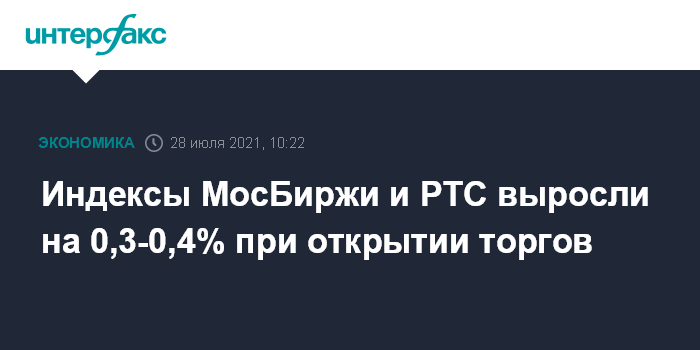 Индексы МосБиржи и РТС выросли на 0,3-0,4% при открытии торгов