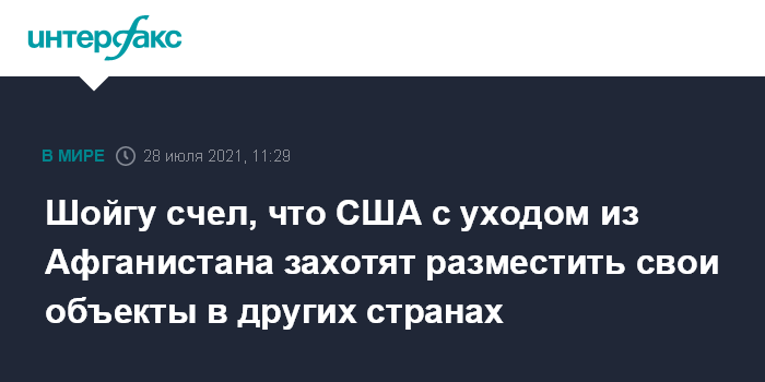 "Поспешный вывод иностранных контингентов спровоцировал дополнительный резкий скачок военно-политической напряжённости и всплеск боевых действий. При этом американцы больше озабочены возможностью создания в центральноазиатских государствах новых транзитных маршрутов и логистических структур, размещением своих военных баз и объектов", - сказал Шойгу.