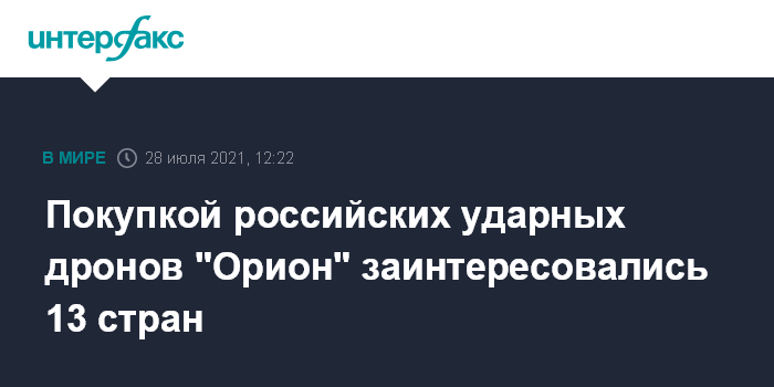 Москва. 28 июля. INTERFAX.RU - Страны СНГ, Ближнего Востока, Юго-Восточной Азии и Африки выразили желание приобрести российские разведывательно-ударные беспилотники "Орион" в ходе МАКС-2021, сообщили в пресс-службе компании-разработчика "Кронштадт".