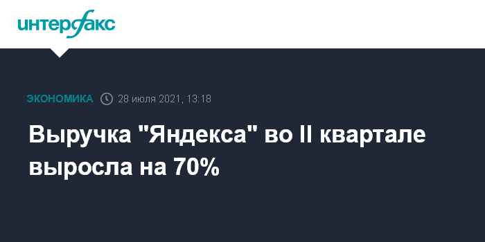 Москва. 28 июля. INTERFAX.RU - Консолидированная выручка "Яндекса" по US GAAP во II квартале 2021 года выросла на 70% по сравнению с аналогичным периодом прошлого года и составила 81,4 млрд рублей, говорится в отчете компании.