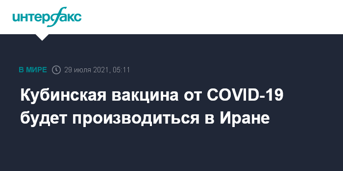 Москва. 29 июля. INTERFAX.RU - Производство разработанной Кубой вакцины от коронавируса Soberana 2 планируется начать на следующей неделе в Иране, сообщили кубинские государственные СМИ.