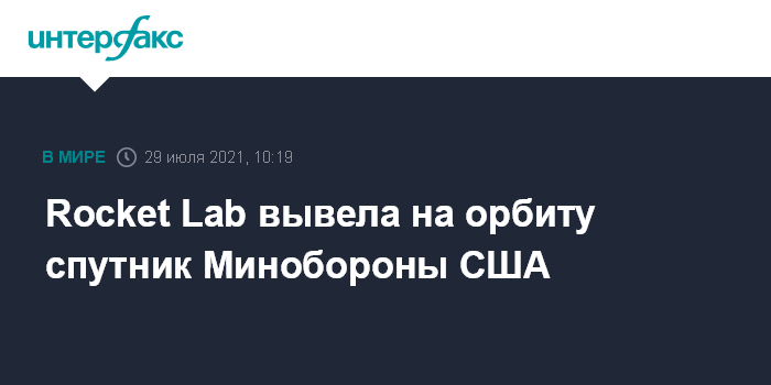 Москва. 29 июля. INTERFAX.RU - Американская аэрокосмическая компания Rocket Lab вывела на орбиту Земли спутник для нужд министерства обороны США с помощью ракеты-носителя Electron, следует из трансляции компании.