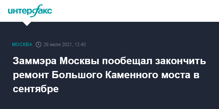 Москва. 29 июля. INTERFAX.RU - Капитальный ремонт Большого Каменного моста в Москве завершится в сентябре 2021 года пообещал заммэра города Петр Бирюков и отметил, что работы идут с опережением графика.