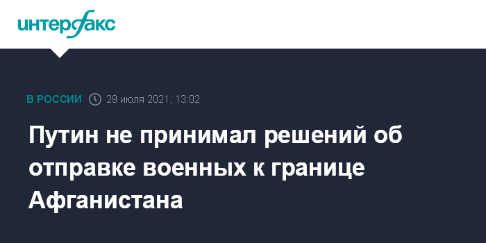 Москва. 29 июля. INTERFAX.RU - Президент РФ Владимир Путин не принимал решения о направлении к границам ее партнеров с Афганистаном дополнительного воинского контингента, заявил пресс-секретарь главы государства Дмитрий Песков.