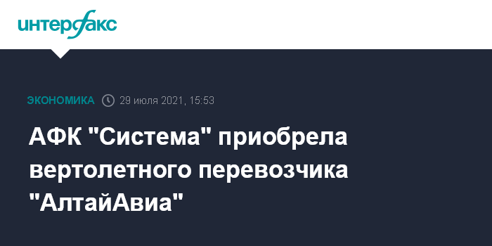 Москва. 29 июля. INTERFAX.RU - Структура АФК "Система" стала единственным владельцем ООО "АлтайАвиа", регионального вертолетного перевозчика, следует из данных системы "СПАРК-Интерфакс".