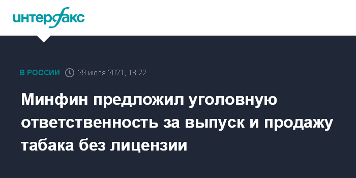 Москва. 29 июля. INTERFAX.RU - Минфин РФ предлагает ввести уголовную ответственность за производство и оборот табачных изделий без лицензии. Проект соответствующего законопроекта размещен на официальном сайте о подготовке нормативных актов.