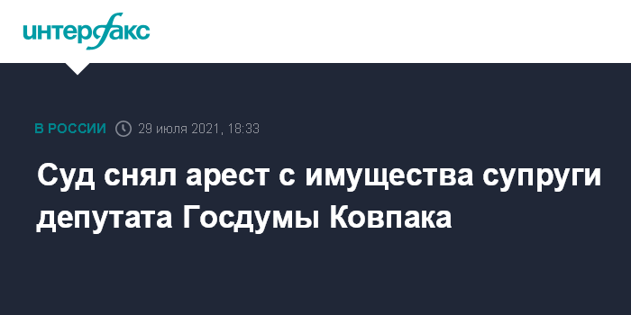 Москва. 29 июля. INTERFAX.RU - Арбитражный суд Свердловской области снял обеспечительные меры с имущества супруги депутата Госдумы Льва Ковпака Вероники Ковпак, освободив, в частности, от ареста ее счета. Об этом сообщил "Интерфаксу" адвокат семьи Ковпаков Андрей Винницкий.