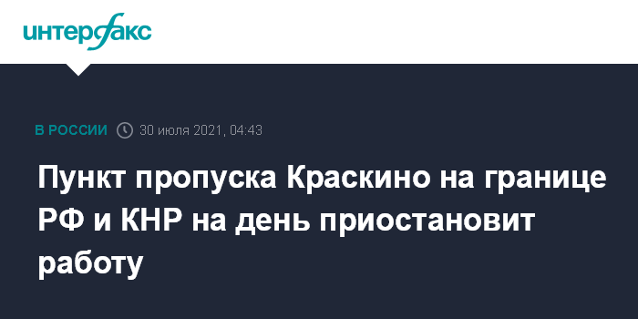 Москва. 30 июля. INTERFAX.RU - Автомобильный пункт пропуска Краскино на российско-китайской границе в Приморском крае не будет работать в первый день августа из-за праздника в КНР, говорится в сообщении Росгранстроя.