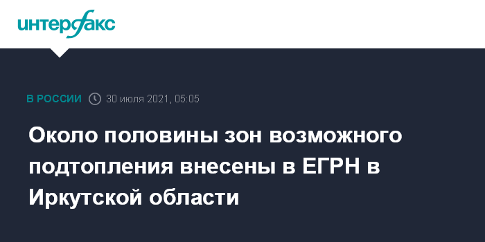 Москва. 30 июля. INTERFAX.RU - Границы зон затопления и подтопления 195 населенных пунктов в Иркутской области внесены в Единый государственный реестр недвижимости (ЕГРН), сообщила в пятницу пресс-служба правительства региона.