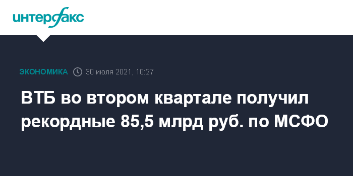 ВТБ во втором квартале получил рекордные 85,5 млрд руб. по МСФО