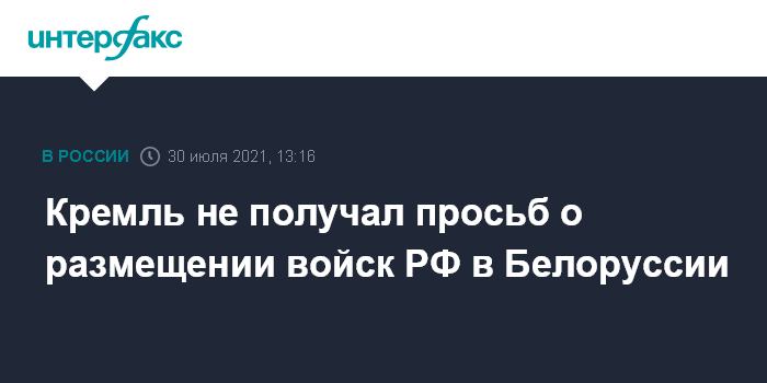 Москва. 30 июля. INTERFAX.RU - Кремль не получал никаких обращений от руководства Белоруссии насчет размещения в республике российских вооруженных сил, заявил пресс-секретарь президента РФ Дмитрий Песков.
