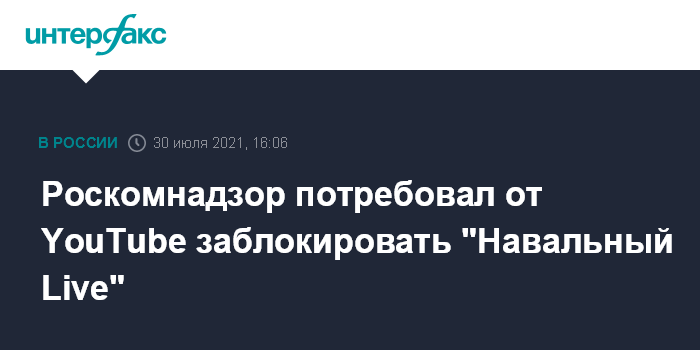 Москва. 30 июля. INTERFAX.RU - Юрист ликвидированного Фонда борьбы с коррупцией (ФБК; запрещен в России, признан властями экстремистской организацией и иноагентом), соратница Алексея Навального Любовь Соболь сообщила, что Роскомнадзор направил видеохостингу YouTube требование заблокировать канал "Навальный Live".