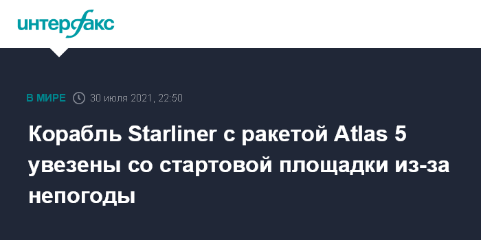 Москва. 30 июля. INTERFAX.RU - Из-за неблагоприятных погодных условий в районе космодрома на мысе Канаверал во Флориде ракета-носитель Atlas 5 с кораблем CST-100 Starliner корпорации Boeing, который должен отправиться к Международной космической станции (МКС), в пятницу были увезены со стартовой площадки в закрытый цех вертикальной сборки, сообщила компания-разработчик носителя United Launch Alliance (ULA).