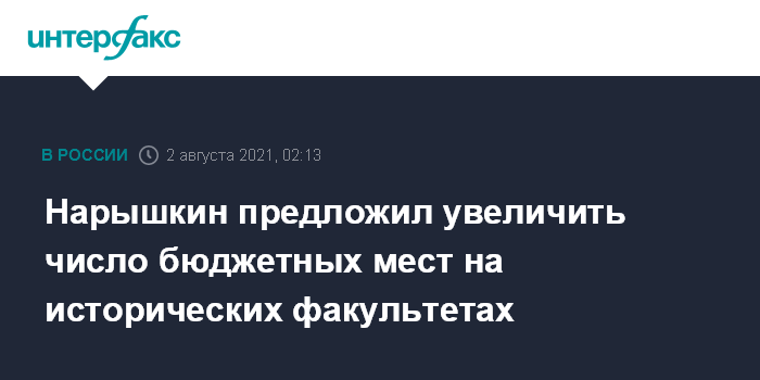 Москва. 2 августа. INTERFAX.RU - Бюджетных мест для студентов, обучающихся на исторических специальностях, должно быть больше, заявил директор Службы внешней разведки РФ, председатель Российского исторического общества (РИО) Сергей Нарышкин в своей статье, опубликованной в понедельник в "Российской газете".