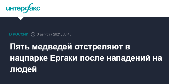 Москва. 3 августа. INTERFAX.RU - Пять бурых медведей отстреляют в природном парке "Ергаки" в Красноярском крае после нападений на людей. Документ о регулировании численности хищников подписал министр экологии и рационального природопользования края Павел Борзых. Приказ опубликован на официальном портале правовой информации правительства региона.