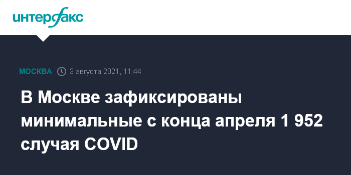 Москва. 3 августа. INTERFAX.RU - В Москве за сутки зафиксировали 1 952 случая заболевания коронавирусом - это минимум с конца апреля, следует из данных оперативного штаба по контролю ситуации с COVID-19.