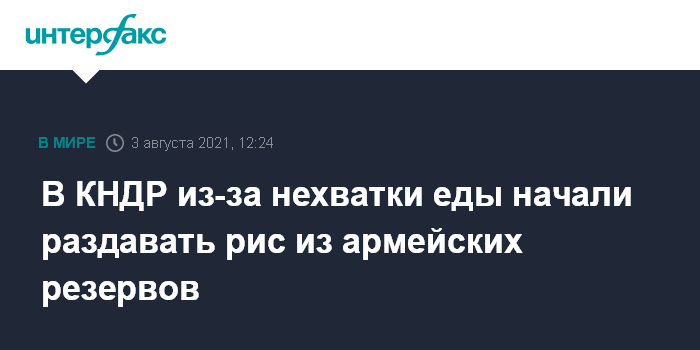 Москва. 3 августа. INTERFAX.RU - КНДР из-за недостатка продовольствия была вынуждена задействовать запасы риса, предназначенные для военных на случай боевых действий. Об этом сообщает во вторник агентство Associated Press (AP) со ссылкой на южнокорейскую разведку.