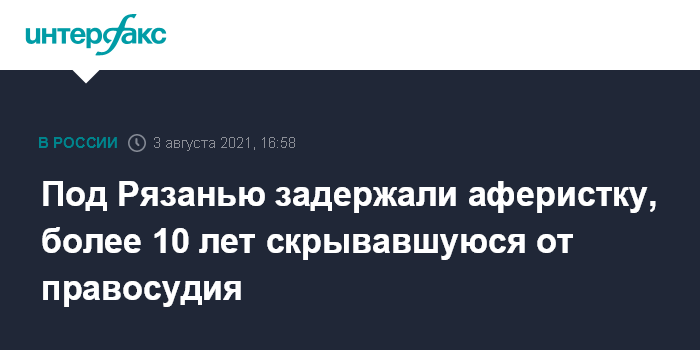 Москва. 3 августа. INTERFAX.RU - Сотрудники рязанской полиции задержали обвиняемую в особо крупном мошенничестве, которая скрывалась от правосудия более 10 лет, сообщила во вторник пресс-служба МВД России.