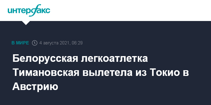 Москва. 4 августа. INTERFAX.RU - Белорусская спортсменка Кристина Тимановская, принимавшая участие в токийской Олимпиаде и отказавшаяся возвращаться на родину, вылетела из японской столицы в Австрию, сообщила телерадиокорпорация ВВС со ссылкой на представителя аэропорта.