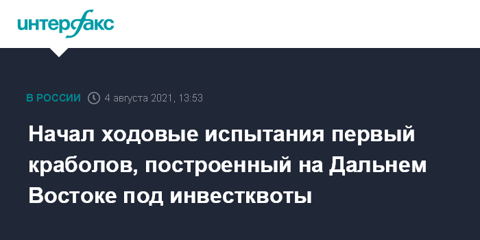 Москва. 4 августа. INTERFAX.RU - Краболовное судно "Охотск", первым построенное на дальневосточных верфях в рамках программы "квоты под киль", проходит заводские ходовые испытания в море. Об этом сообщила пресс-служба АО "Восточная верфь" (Владивосток). Это предприятие строит пять краболовных судов проектов 03141 и 03140 для добычи и переработки краба.