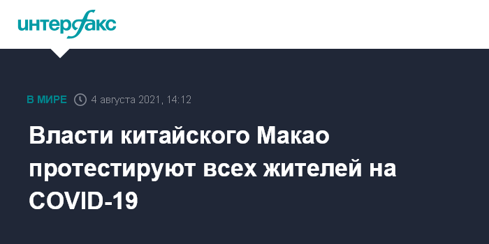 Москва. 4 августа. INTERFAX.RU - Администрация специального административного района КНР Макао после выявления четырех случаев COVID-19 возьмет у населения региона, где проживают более 600 тыс. человек, анализы на коронавирус, сообщает в среду телеканал Channel News Asia.