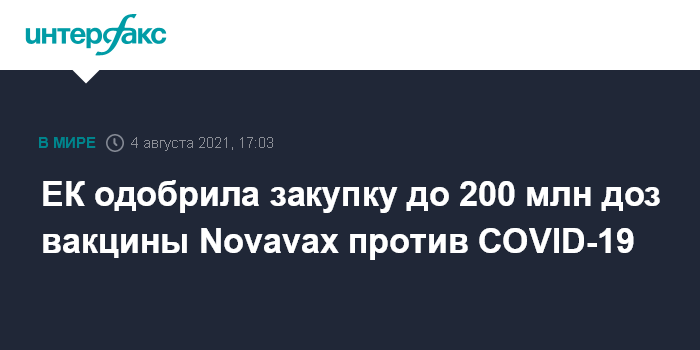 Москва. 4 августа. INTERFAX.RU - Европейская комиссия (ЕК) объявила в среду об одобрении нового контракта на потенциальные поставки вакцины против COVID-19 производства американского фармацевтического концерна Novavax.