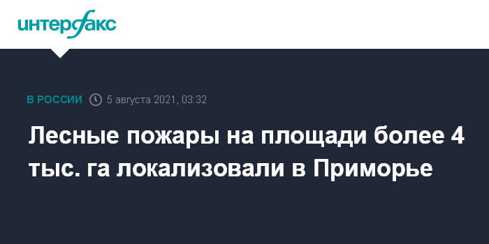 Москва. 5 августа. INTERFAX.RU - Четыре лесных пожара на площади более чем 4 тыс. гектаров локализовали в Приморском крае - возгорания зарегистрировали в Тернейском муниципальном округе и Красноармейском районе, сообщили в четверг в пресс-службе правительства региона.