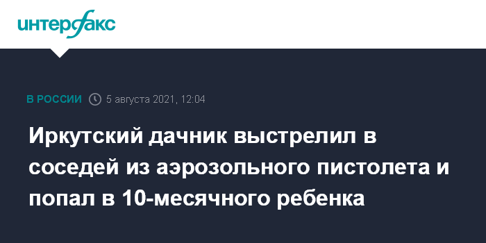 Москва. 5 августа. INTERFAX.RU - Уголовное дело возбуждено в Иркутской области в отношении мужчины, который, выстрелив из аэрозольного пистолета в сторону соседского участка, попал в 10-месячного ребенка. Об этом сообщает Следственное управление СКР по региону.