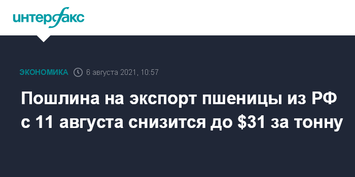 Москва. 6 августа. INTERFAX.RU - Экспортная пошлина на пшеницу с 11 августа снизится до $31 с нынешних $31,4 за тонну, следует из данных Минсельхоза РФ.