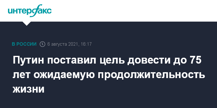 Москва. 6 августа. INTERFAX.RU - Президент Владимир Путин поручил правительству до 15 сентября изменить целевые показатели достижения национальных целей развития, предусмотрев достижение показателя ожидаемой продолжительности жизни 75 лет по итогам 2025 года.