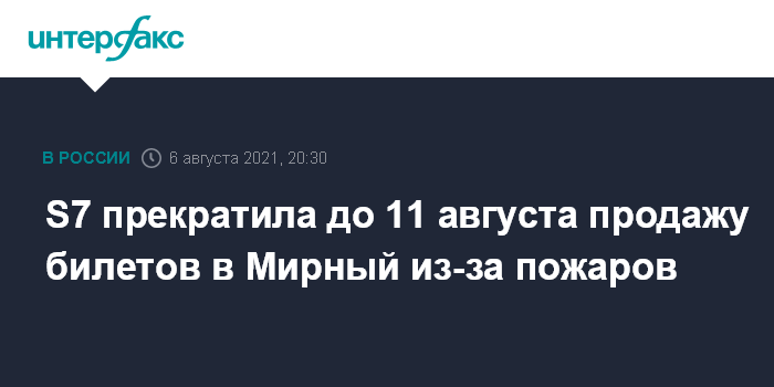 Москва. 6 августа. INTERFAX.RU - Авиакомпания S7 приостановила до 11 августа продажу билетов в город Мирный из-за ограничившего видимость дыма от лесных пожаров в районе аэропорта, сообщила пресс-служба Минтранса Якутии.