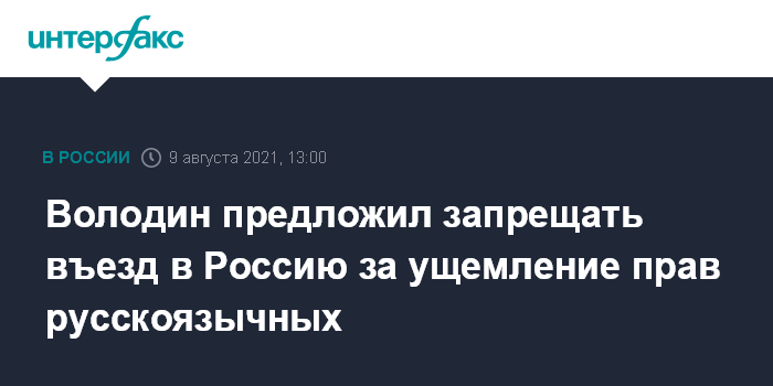 Москва. 9 августа. INTERFAX.RU - Депутаты Госдумы предложили обсудить и ввести меры реагирования, в том числе в виде запрета на въезд в Россию, для тех, кто за границей ущемляет права русскоязычных, написал в своем телеграм-канале спикер палаты Вячеслав Володин.