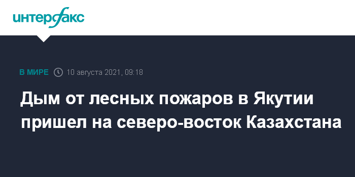 Москва. 10 августа. INTERFAX.RU - Дымовая завеса от лесных пожаров в Якутии распространилась на северо-восточные регионы Казахстана, сообщила пресс-служба РГП "Казгидромет".
