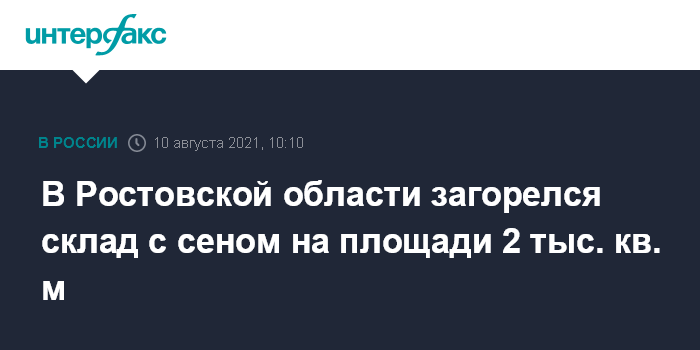 Москва. 10 августа. INTERFAX.RU - Кровля склада для сена загорелась утром во вторник на территории населенного пункта Рясное в Матвеево-Курганском районе Ростовской области. Об этом сообщает пресс-служба ГУ МЧС России по региону.