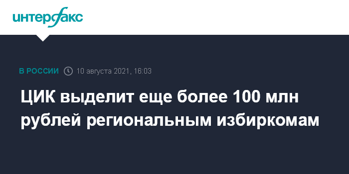 Москва. 10 августа. INTERFAX.RU - Центризбирком России намерен дополнительно выделить более 100 млн рублей региональным избирательным комиссиям на проведение сентябрьских выборах. Об этом говорится в проекте постановления ЦИК, которое будет рассмотрено 10 августа.