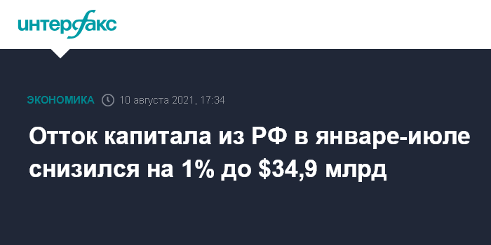 Москва. 10 августа. INTERFAX.RU - Чистый вывоз капитала частным сектором из России в январе-июле 2021 года, по предварительной оценке, составил $34,9 млрд, что на 1% меньше, чем за аналогичный период 2020 года ($35,3 млрд). Об этом сообщает сайт ЦБ РФ.