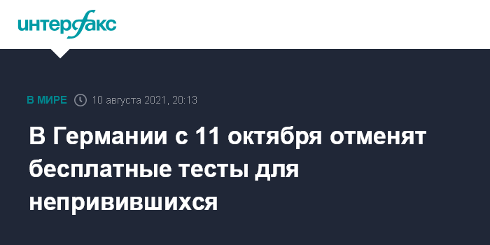Москва. 10 августа. INTERFAX.RU - Власти Германии решили с 11 октября отменить бесплатные тесты на коронавирус для тех, кто мог сделать прививку, но по каким-то соображениям не стал этого делать. Такое решение было принято на совещании канцлера ФРГ Ангелы Меркель с руководителями земель.