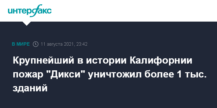 Москва. 11 августа. INTERFAX.RU - Крупнейший в истории Калифорнии природный пожар "Дикси" продолжает набирать силу, уже уничтожено по меньшей мере 1 тыс. зданий, 550 из которых - жилые дома, сообщает Associated Press.