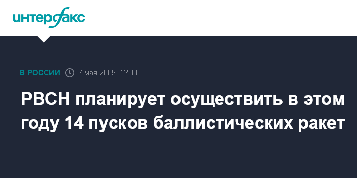 Москва. 7 мая. INTERFAX.RU - Командующий РВСН генерал-полковник Николай Соловцов заявил, что на 2009 год запланировано проведение 14 учебно-боевых и испытательных пусков баллистических ракет. "В этом году мы планируем провести 14 пусков ракет с решением различных задач", - сказал Н.Соловцов в четверг журналистам.