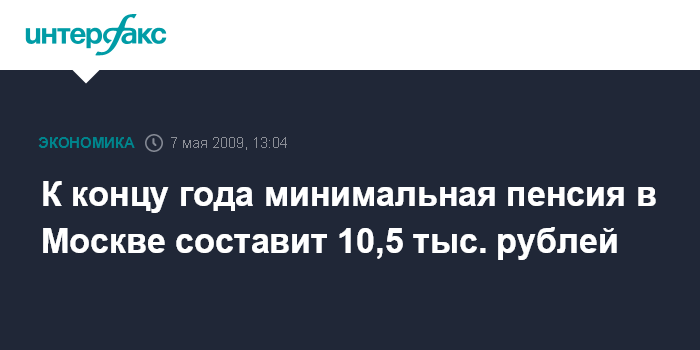 Москва. 7 мая. INTERFAX.RU - К концу 2009 г. минимальная пенсия в российской столице составит 10,5 тыс. рублей, сообщила в интервью "Интерфаксу" первый заместитель мэра в правительстве Москвы Людмила Швецова.