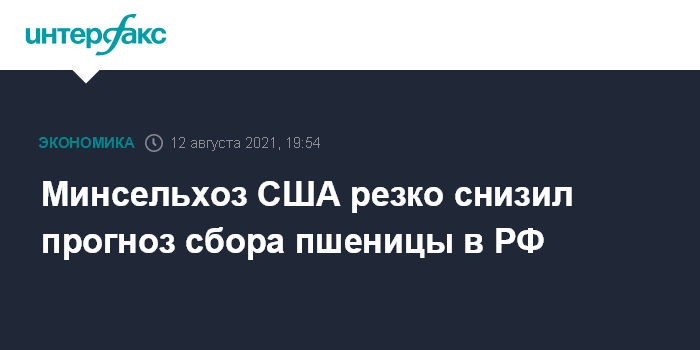 Москва. 12 августа. INTERFAX.RU - Минсельхоз США резко, с 85 млн до 72,5 млн тонн, снизил прогноз сбора пшеницы в РФ в этом году, следует из августовского обзора ведомства.